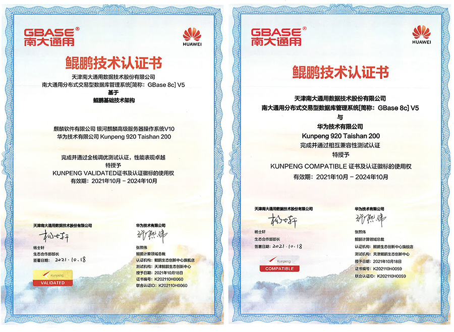 GBase 8c V5版本与华为Kunpeng 920 Taishan 200服务器,完成并通过全栈调优测试认证,性能表现卓越。