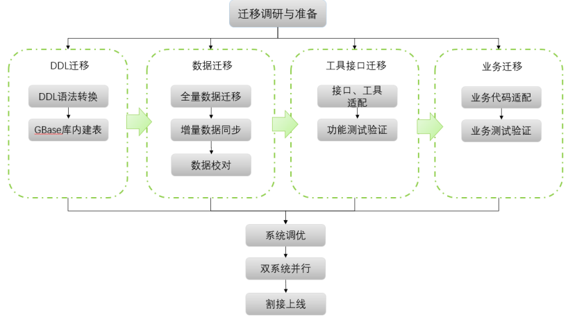 GBase 8s提供平滑迁移整体解决方案,可使替换过程中GBase 8s数据库应用上线过程风险总体可控、系统运行平滑。整个过程分为三个阶段: