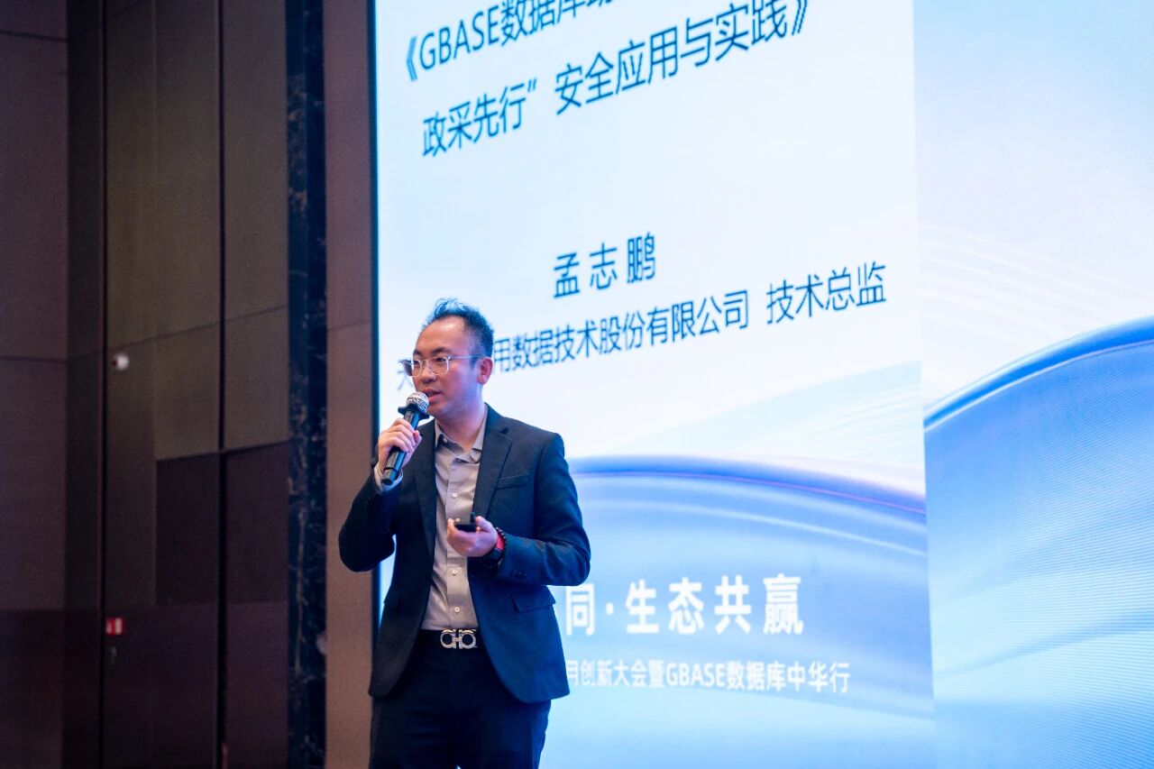 在活动主题分享环节,GBASE南大通用技术总监孟志鹏发表《GBASE数据库助力“国产领航,政采先行”安全应用与实践》主题演讲。