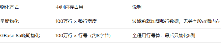 GBase 8a的晚期物化,逻辑很简单:“全程用行号(Row ID)计算,只在最后一步才加载真实数据。”