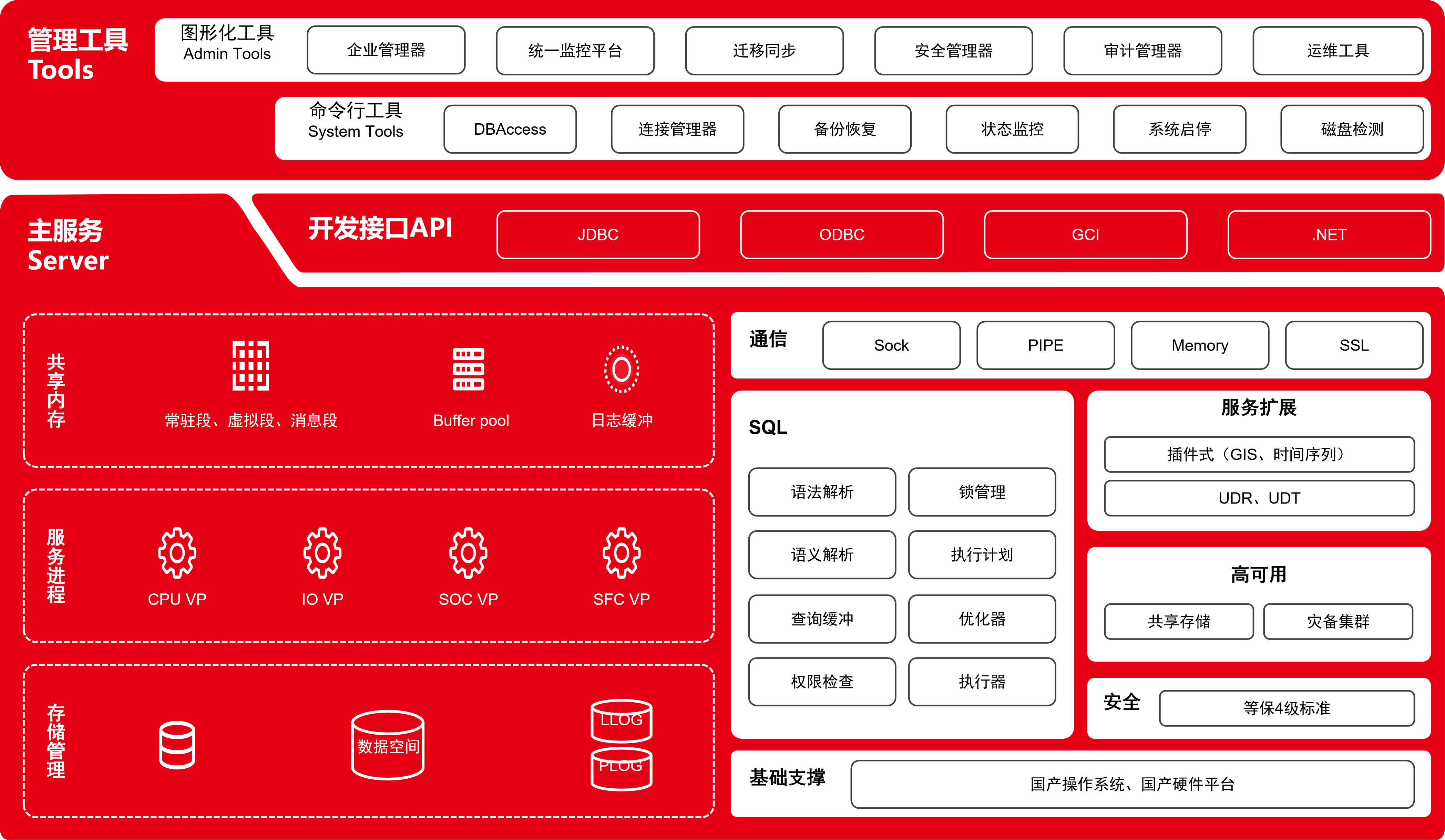 自主研发的企业级交易型数据库管理系统,基于共享存储架构,专为金融、电信、政府等行业关键核心业务系统设计。产品达到等保四级标准(国际B2),支持国密算法,支持SQL92/99/2003标准及主流开发接口,能够在90%以上场景中替换国际主流数据库