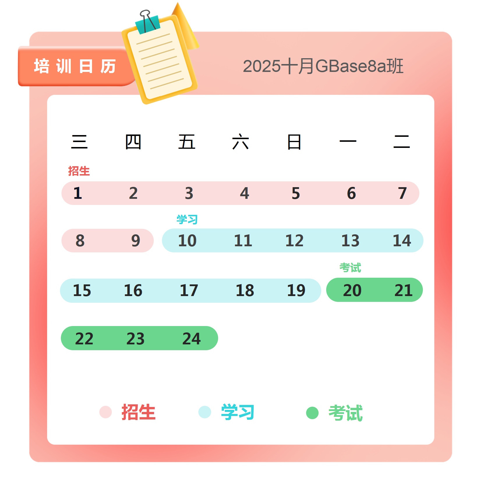 GBASE培训中心计划于2025年10月10日举办“2025十月GBase 8a MPP Cluster 认证培训班”,数据库版本是市场普及版。全程免费:免费报名、免费的安装介质、免费的技术答疑、考试通过者免费获得具备国产数据库认证资质的数据库管理电子证书。欢迎踊跃报名!